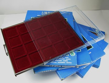 6 stk. Lindner stapelbare, transparente møntbokse. Nr. 2721 til 20 mønter op til 47 mm., 2780 til 80 mønter op til 24 mm., nr. 2720 til 20 mønter op til 47 mm., nr. 2799 til 99 mønter op til 19 mm., nr. 2145 til 45 mønter i varabel størrelse samt boks til 20 mønter op til 47 mm. Bortset fra den sidstnævnte er alle nye i original salgspakning.