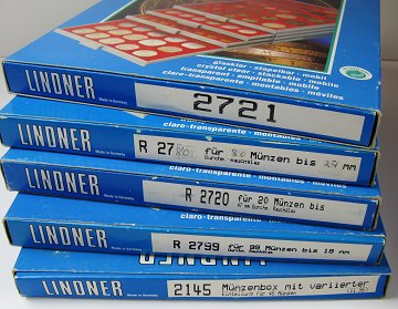 6 stk. Lindner stapelbare, transparente møntbokse. Nr. 2721 til 20 mønter op til 50 mm., 2780 til 80 mønter op til 24 mm., nr. 2720 til 20 mønter op til 47 mm., nr. 2799 til 99 mønter op til 19 mm., nr. 2145 til 45 mønter i varabel størrelse samt boks til 20 mønter op til 47 mm. Bortset fra den sidstnævnte er alle nye i original salgspakning.