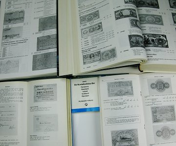 Samling numismatisk litteratur, bestående af 2 KP standard kataloger "World Paper Money", 5. og 7. udgave, Sieg's seddelkatalog 1884 - 1976 indbunden, Sieg's seddelkatalog 2001, De nordatlantiske øer, Danmarks Nationalbank, Slesvig samt Mynt & Sedler Sverige 1999/2000. 8 bind i alt.