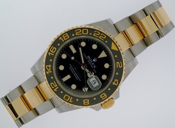 Herrearmbåndsur fra Rolex, model GMT-Master II, ref.nr.: 116713, i kasse af stål, oysterlænke i guld/stål, guldlynette m. keramisk rand, sort skive m. punktindeks, datoangivelse ved 3" position, safirglas, manuelt/automatisk urværk. Ø. 40 mm.