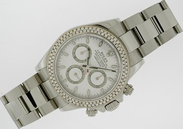 Herrearmbåndsur fra Rolex, model Daytona, ref.nr.: 116520, F-serie, i kasse og m. oysterlænke af stål, hvid skive m. stregindeks, juveléreftersat brillantlynette i hvidguld, safirglas, chronograffunktion, manuelt/automatisk urværk. Ø. 40 mm.