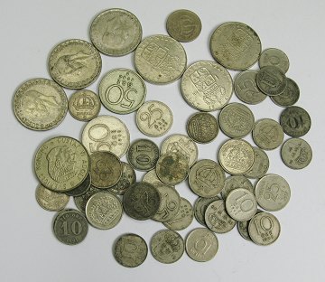 Sverige, samling mønter beståendede af 7 stk. 1 kr, 2 stk. 50 ører, 12 stk. 25 ører, og 27 stk. 10 ører,