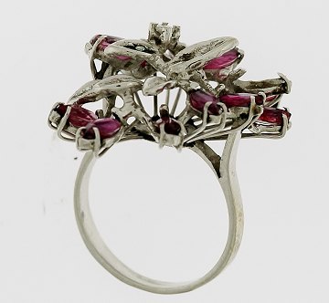 Polsk ring af 18 kt. rhodineret guld, prydet m. brillantslebne diamanter på ialt ca. 0,075 ct. samt 13 navetteslebne ædelsten, muligvis lyse rubiner. Str. 53.