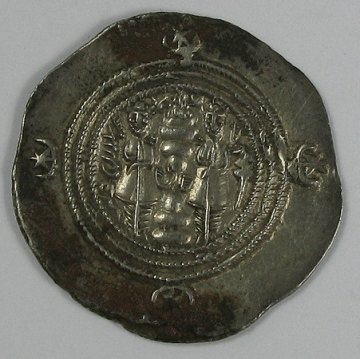Sølvmønt fra Sassaniderne, persisk herskerdynasti 651-224 f. Kr. Landet omfattede dele af Iran, Armenien, Afghanistan, Tyrkiet, Ægypten, Jordan, Libanon, Syrien og Pakistan. Ca. Diam. 31 mm., vægt ca. 4,1 gr.