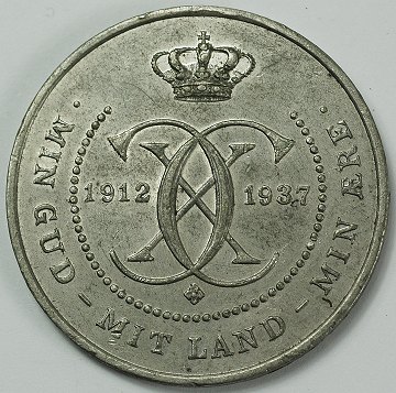 Medaille af tin, præget i anledning af Christian X´s 25 år regentjubilæum, 1937. På fs. ses kongen portræt i profil, men der på bs. står kongens valgsprog: "Min Gud - Mit Land - Min Ære". Ø. 39 mm.