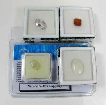 Lot med 4 ædelsten med certifikater i form af oval chabochonsleben opal, 6,68 ct. - facetsleben gul safir - oval facetsleben ametyst, 7,17 ct. - facetsleben garnet, 4,46 ct.