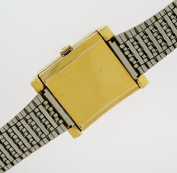 Herrearmbåndsur fra Omega, model De Ville, i stor kasse af forgyldt stål, gylden skive m. stregindeks, kantsleben safirglas, monteret m. uoriginal lænke af stål. Diam.: 28 x 35 mm.