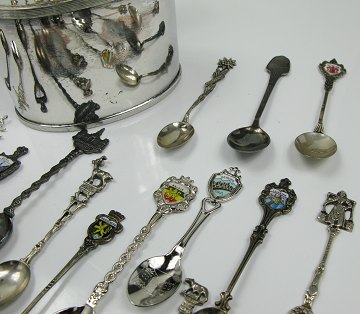 Oval engelsk Sheffield thédåse og 16 stk. souvenir théskeer af sølvplet, heraf tre skeer af samlet 28 gr. sølv. Thédåsen H. ca. 11 cm.