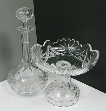 Dansk karaffel, tilskrevet Fyens glasværk, samt opsats af krystal. H. ca. 25 og 15 cm.