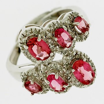 Ring af 14 kt. hvidguld, prydet m. talrige mindre brillantslebne diamanter på ialt ca. 0,30 ct., der omkranser seks ovalslebne lyserøde safirer. Str. 53.