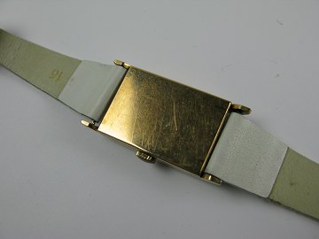 DGH dameur i kasse af 14 kt. guld. Rektangulær skive af messing med arabertal og separat sekundviser. Hvid læderrem med metalspænde. Urkasse ca. 20 x 28 mm. vægt. ca. 24,5 gr.