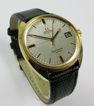 Omega Seamaster Cosmic Automatic herrearmbåndsur i kasse af goulddoublé. Metalfarvet skive med stregindikationer, central sekundviser og datovisning i #3 positionen. Urkasse Diam. ca. 35 mm.