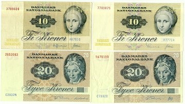 Lot danske sedler, bestående af: 10 kr 1972,-73,-76(3),-77 samt 20 kr 1983,-88.