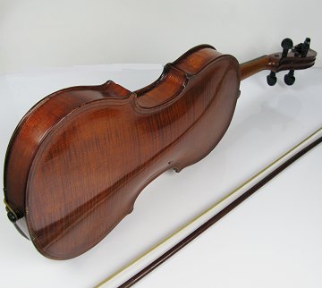 Sydtysk violin og bue, nylakeret resonanskasse med dobbelt kantstribe og nylakeret snegl. Original strengeholder med finstemmer samt fornyet stol. Bue med perlemorpynt. Violin L. ca. 61 cm.
