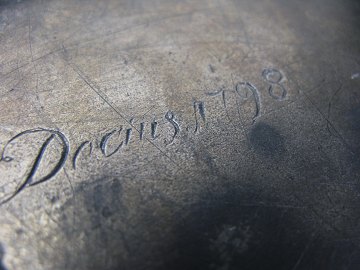 Gl. rundt tinfad med kantdekorationer, stemplet engels Tin og fremstillingsmærker samt årstal 1798. Diam. ca. 29 cm.