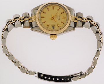 Damearmbåndsur fra Rolex, model Oyster Perpetual Date, ref.nr.: 6917, i kasse og m. jubileelænke af 18 kt. guld og stål, champagnefarvet skive m. stregindeks, datoangivelse ved 3" position, automatisk urværk. Ø. 30,5 mm.