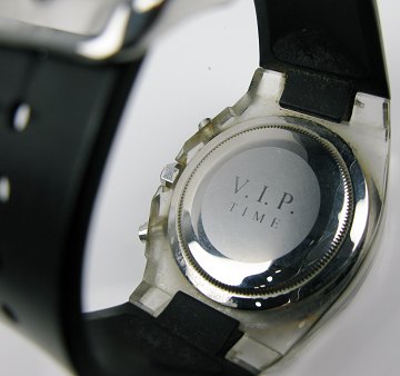 V.I.P. Time herrearmbåndsur i kasse af stål i plexiramme. Sort mønstret skive med arabertal og stregindikationer, central sekundviser og chronometerfunktioner. Quartzværk. Gummilænke med metalspænde. Urkasse Diam. ca. 45 mm. Salgscertifikat medfølger.