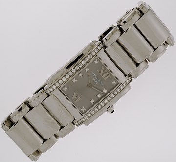 Damearmbåndsur fra Patek Philippe, model Twenty-4, i kasse og m. lænke af stål, sølvfarvet skive m. 10 brillantslebne diamanter og romertal, urkassen er ligeledes prydet m. brillantslebne diamanter, krone m. safir, safirglas, quartzurværk. Ø. 25x30 mm.