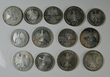 Lot Tyskland, bestående af 5 mark 1969, 1973 (2), 5 mark 1974 (2), 5 mark 1973 (2), 5 mark 1975 samt 10 mark 1987 (2), 10 mark 1972 (5). 13 mønter i alt.