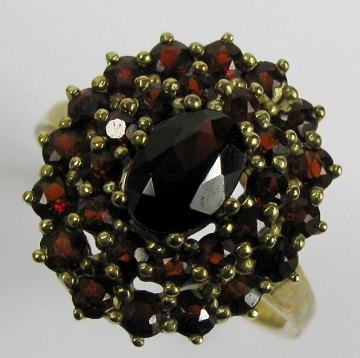 Ring af 8 kt. guld, roset prydet med facetsleben granat ca. 7 x 4 mm., omkranset af talrige mindre granater. Str. 54, samlet vægt ca. 3,8 gr.