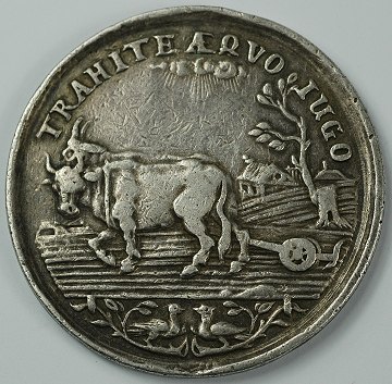Interresant medaille, formentlig hollandsk, af sølv, præget m. havneparti på den ene side og okser ved en plov på den anden. Den latinske tekst lyder: "FRANGIMUR SI COLLIDIMUR ( ”Hvis vi kolliderer, er vi fortabte” (Matthæus evangeliet))