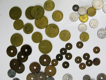 Samling Danmark, 2 kr, 1 kr, 10 ører, 2 ører og 1 ører samt lidt nyere danske mønter og tyske mark og pfennige. I alt 199 stk.