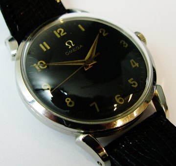 Omega Vintage herrearmbåndsur i kasse af stål med sort skive, forgyldte arabertal, visere og stregindikationer samt central sekundviser. Manuelt optræksværk. Urkasse Diam. ca. 35 mm., original Omega læderlænke.