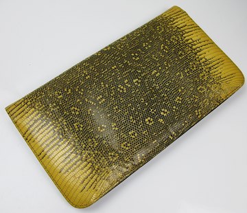 Teater håndtaske, udvendig dekoreret med formodentlig phyton slangeskind, indvendig foret med sort skind samt lukkeklap til inderfag med lynlås. 29 x 16 cm.