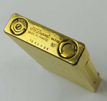 S.T. Dupont Paris, lighter af forgyldt metal med flintesten gnisttænding. Model 1 G 5 CV 34. 53 x 30 x 7 mm. Original salgsæke samt læderetui, garantioplysninger, certifikat og brugsvejledning medfølger.