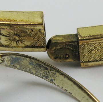 A. Dragsted armlænke af guld doublé, dekoreret med blomstermønster. Diam. ca. 60 mm. samt granatring af gulddoublé, Str. 58.