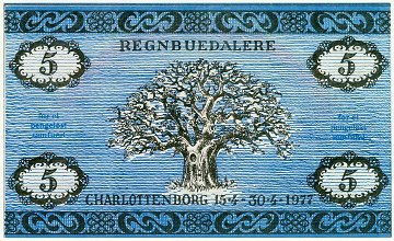 I forbindelse m. festivalen "Kærlighed og Kaos", der blev afholdt på kunstinstitutionen Charlottenborg i 1977, blev der udformet tre "sedler" m. denominationen "regnbuedaler". Overskuddet gik til vedligeholdelse og renovering af Fristaden.