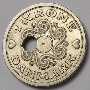 Spændende fejlpræget mønt, hvor hullet er udstandset uden for centrum.