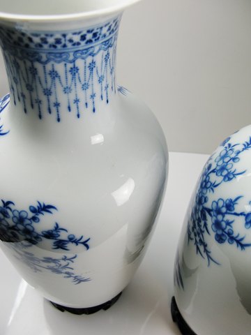 Par balusterformede kinesiske prydvaser på drejelig stand af kunststof. Dekoreret med fugle på blomstegren samt ornamentik foroven og forneden, undersiden med eens kinesiske skrifttegn på begge vaser. På bagsiden svagt underglasurportræt af den tidl. formand, Mao Tse Tung samt skrifttegn og JS 8888. Begge H. ca. 56,5 cm. Kina omkring 1970.