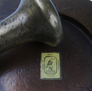 Solvognsplatte af ædelmalm og pistil af messing, førstnævnte med producentmærkat "N-Ædelmalm". Diam. ca. 19,5 cm., pistil L. ca. 26 cm.