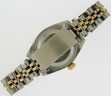 Damearmbåndsur fra Rolex, model Datejust, ref.nr.: 6917, i kasse og m. jubileelænke af 18 kt. guld og stål, sort skive m. brillanter, datoangivelse ved 3" position, automatisk urværk. Ø. 25 mm.