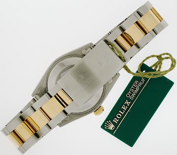 Midsize damearmbåndsur fra Rolex, model Oyster Perpetual, ref.nr.: 67513, i kasse og m. oysterlænke af 18 kt. guld og stål, hvid skive m. romertal og stregindeks, safirglas, automatisk urværk. Ø. 31 mm.