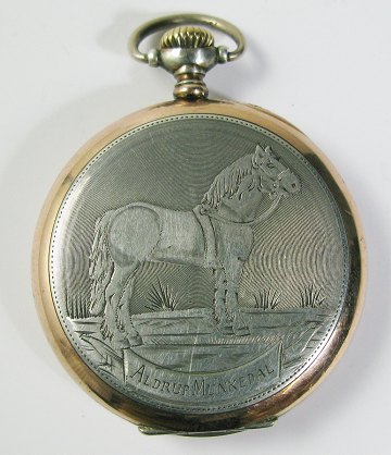Schweizisk lommeur af sølv med inderkapsel af metal. Hvid emailleskive med arabertal og separat sekundviser. Bagsiden med gravure i form af arbejdshest samt " Aldrup Munkedahl". Diam. ca. 50 mm., samlet vægt ca. 79,5 gr. Importør: Christian Filtenborg, Horsens.