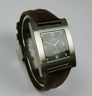 Carly Rex Denmark, damearmbåndsur i ligesidet kasse af stål. Sort skive med arabertal og punktindikationer, central sekundviser. Urkasse 30 x 37 mm. Quartzværk. Læderlænke med metalspænde.