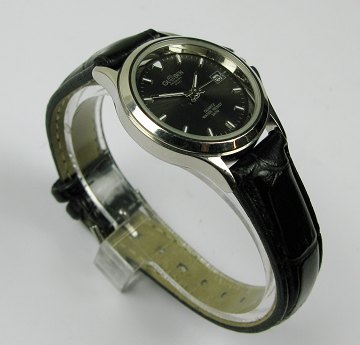 Globen Denmark, damearmbåndsur i kasse af stål med gråsort skive, stregindikationer, datovisning i #3 positionen. Quartzværk. Urkasse Diam. ca. 28 mm. Kroko imitat læderlænke med metalspænde.