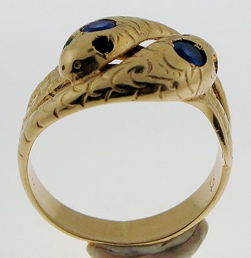 Herrering af 14 kt. guld fra Bernhard Hertz, udført m. slangehoveder og prydet m. farvede stene. Str. 60.