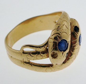 Herrering af 14 kt. guld fra Bernhard Hertz, udført m. slangehoveder og prydet m. farvede stene. Str. 60.