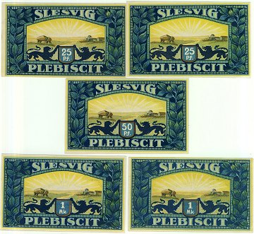 Lot nødpengesedler fra Vojens, bestående af 25 pf. (2), 50 pf. samt 1 mark (2). Sieg 114, 115, 116.