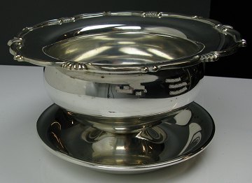 Skønvirke sauciere af sølvplet med buet, svejfet kant, monteret på underskål. Diam. ca. 20 cm., H. ca. 10,5 cm.