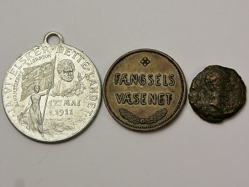 Lot medailler bl.a.: Fængselsvæsenet, 25 øre, norsk medaille m. Bjørnstjerne Bjørnson, Århus Medaille 1990, romersk kobbermønt samt FALSK mexikansk 2 pesos.