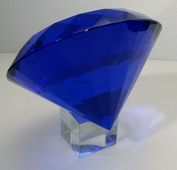 Sten fra vinduesudstilling i form af diamantsleben, safirfarvet glas på udstillingspodie af plexiglas. Diam. 20 cm., Vægt 4,685 kg.