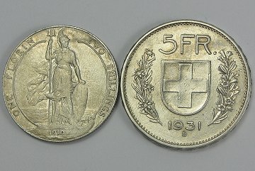 To ældre sølvmønter - Florin 1910 samt 5 francs 1931