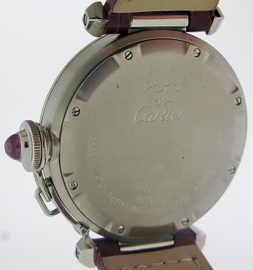 Damearmbåndsur fra Cartier, model Pasha, ref.nr.: W3108299, i kasse af stål m. violet skive m. arabertal, datoangivelse ved 5" position, safirglas, krone m. carbochonsleben rosafarvet sten, monteret m. original krokodillerem og spænde, automatiske urværk. Ø. 36 mm.