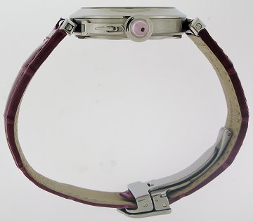 Damearmbåndsur fra Cartier, model Pasha, ref.nr.: W3108299, i kasse af stål m. violet skive m. arabertal, datoangivelse ved 5" position, safirglas, krone m. carbochonsleben rosafarvet sten, monteret m. original krokodillerem og spænde, automatiske urværk. Ø. 36 mm.