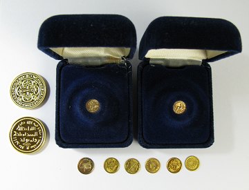 Lot medailler og miniaturemedailler af "guld", præget som diverse mønter, bl.a. bestående af: "Krügerrand"(2) i etui, "Sovereign", "100 pesetas".