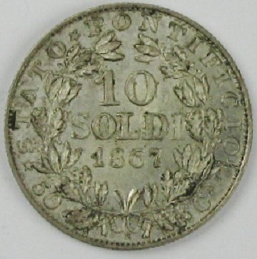 Vatikanstat, Pius IV, 10 soldi 1867 af sølv - KM 1376.